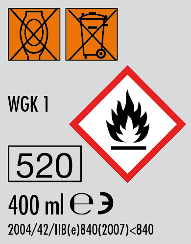 Gefahr: Extrem entzündbares Aerosol. Behälter steht unter Druck: kann bei Erwärmung bersten. Ist ärztlicher Rat erforderlich, Verpackung oder Kennzeichnungsetikett bereithalten. Darf nicht in die Hände von Kindern gelangen. Vor Gebrauch Kennzeichnungsetikett lesen. Von Hitze, heißen Oberflächen, Funken, offenen Flammen und anderen Zündquellen fernhalten. Nicht rauchen. Nicht gegen offene Flamme oder andere Zündquelle sprühen. Nicht durchstechen oder verbrennen, auch nicht nach Gebrauch. Vor Sonnenbestrahlung schützen. Nicht Temperaturen über 50 °C/122 °F aussetzen. Ohne ausreichende Lüftung Bildung explosionsfähiger Gemische möglich.