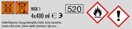 Gefahr: Extrem entzündbares Aerosol. Behälter steht unter Druck: Kann bei Erwärmung bersten. Verursacht schwere Augenreizung. Kann Schläfrigkeit und Benommenheit verursachen. Giftig für Wasserorganismen, mit langfristiger Wirkung. Ist ärztlicher Rat erforderlich, Verpackung oder Kennzeichnungsetikett bereithalten. Darf nicht in die Hände von Kindern gelangen. Vor Gebrauch Kennzeichnungsetikett lesen. Von Hitze/Funken/offener Flamme/heißen Oberflächen fernhalten. Nicht rauchen. Nicht gegen offene Flamme oder andere Zündquelle sprühen. Einatmen von Staub/Rauch/Gas/Nebel/Dampf/Aerosol vermeiden. BEI KONTAKT MIT DEN AUGEN: Einige Minuten lang behutsam mit Wasser spülen. Vorhandene Kontaktlinsen nach Möglichkeit entfernen. Weiter spülen. Unter Verschluss aufbewahren. Entsorgung des Inhalts/des Behälters gemäß den örtlichen/regionalen/nationalen/internationalen Vorschriften. Vor Sonnenbestrahlung und Temperaturen über 50 °C schützen. Auch nach Gebrauch nicht gewaltsam öffnen oder verbrennen. Enthält Propan, Butan. Nicht restentleerte Dosen zur Problemstoffsammelstelle bringen. Dose nur völlig entleert dem Weißblech-Recycling, Kappe und Sprühkopf dem Kunststoff-Recycling zuführen.